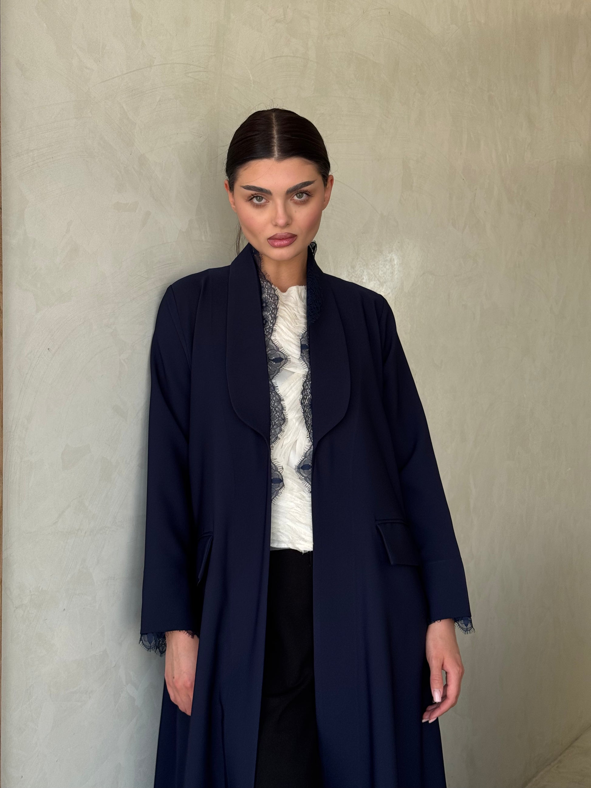 Design: Blazer-inspired silhouette with a defined collar, accented with delicate lace for a luxurious feminine touch.